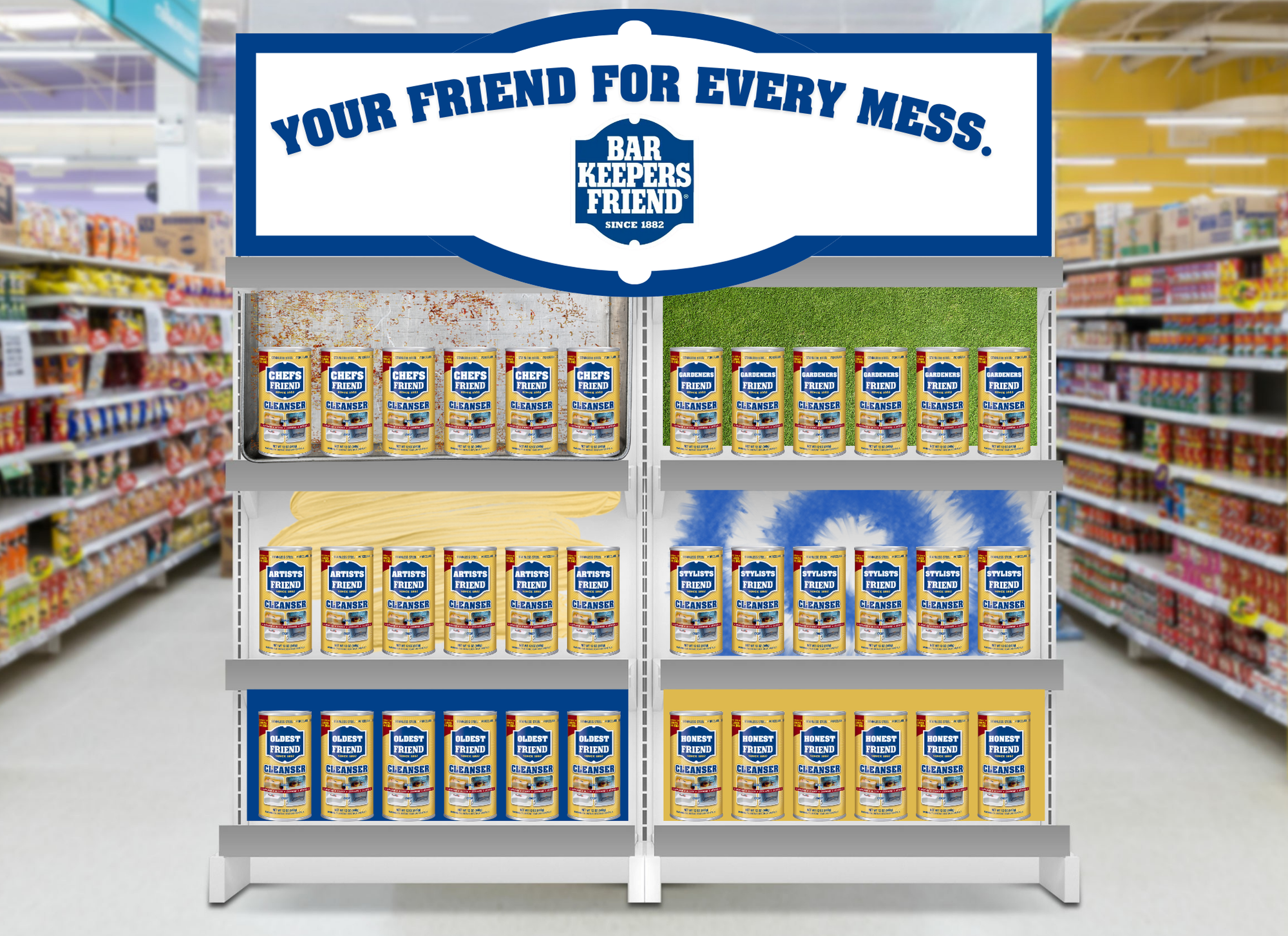 A visually compelling display area helps the target audience understand with a quick glance which personalized packaging best suits their needs, highlighting the benefit of Bar Keepers Friend.