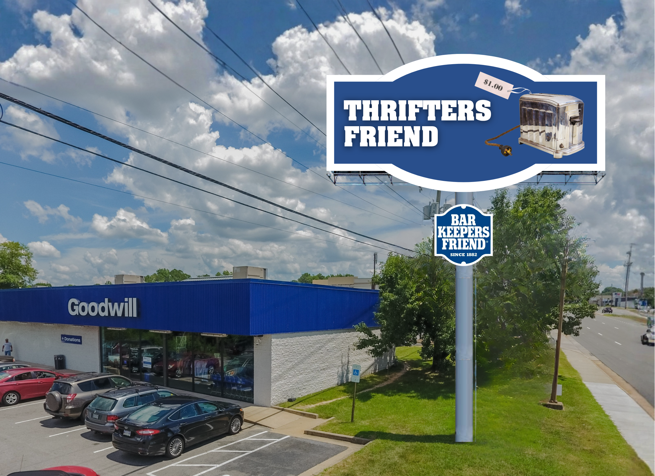 Billboards in the distinctive shape of the Bar Keepers Friend signature saloon door logo guide brand recognition and awareness.