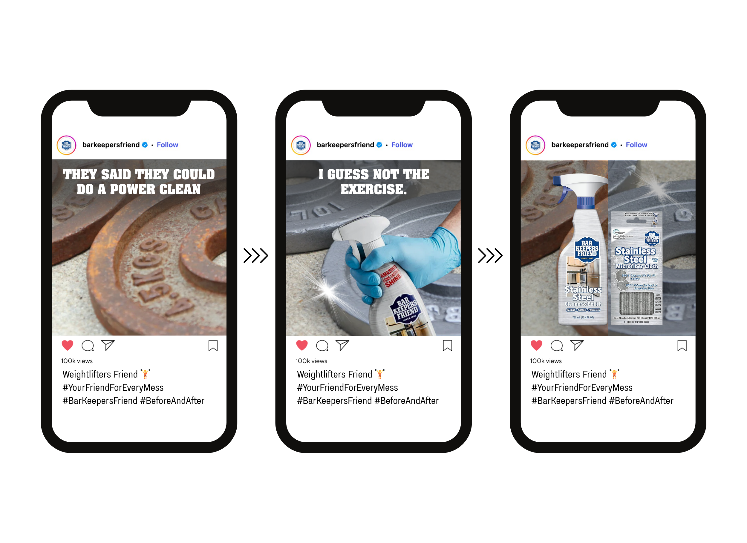 Instagram ads encourage audiences to “swipe for a clean result”, showcasing before and after visuals of how effective Bar Keepers Friend is.