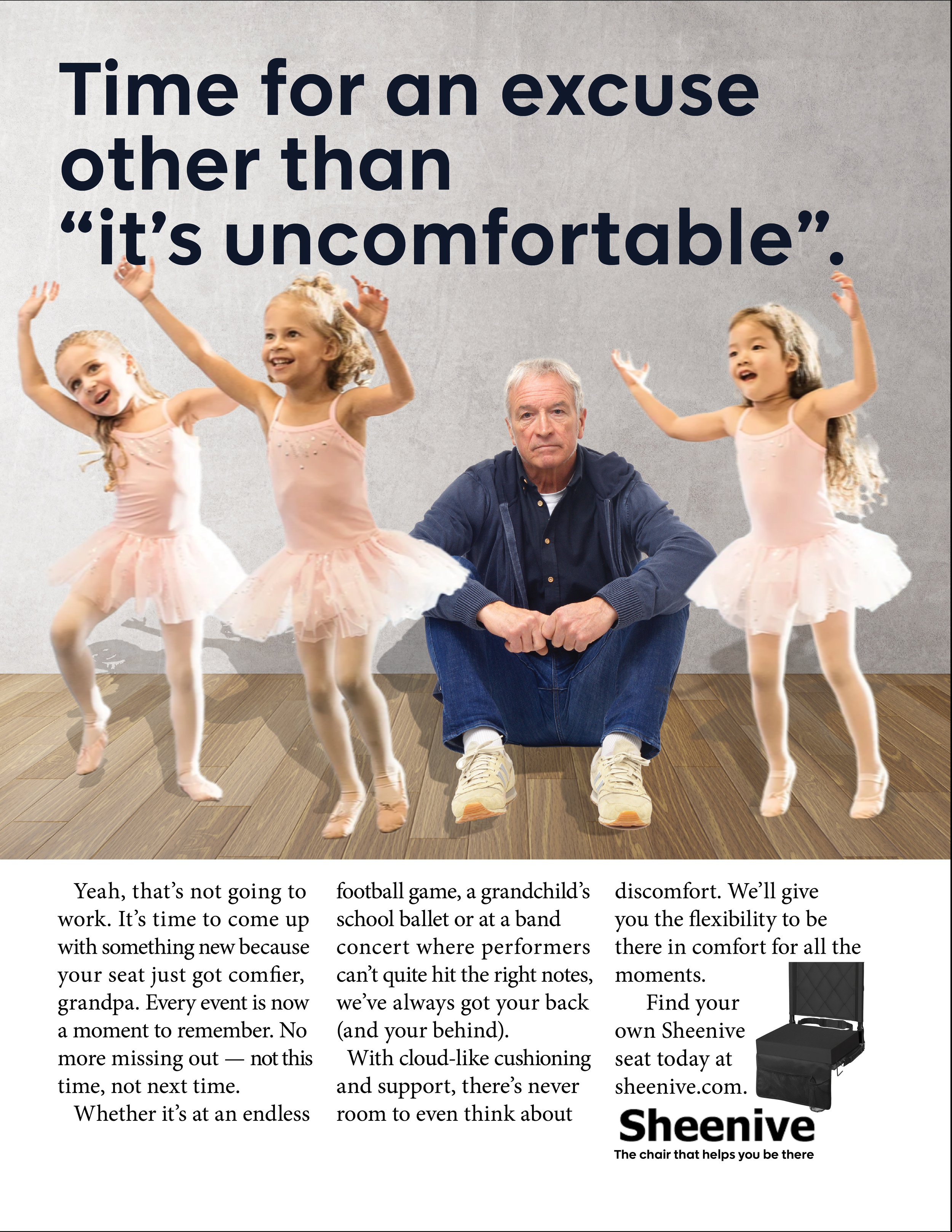 We all want to make every event, but it can be tough to do because of time constraints and travel limitations. It certainly doesn’t help that most events don’t have comfortable seating. You’re lucky to find seating at events, and if there is seating, it’s usually those hard, cold bleachers. That is why Sheenive Stadium Seats are designed with the highest quality of comfort for you to make every single one of life’s moments. This campaign emphasizes that one can discover that Sheenive Stadium Seats provide the comfort as The Chair That Helps You Be There.